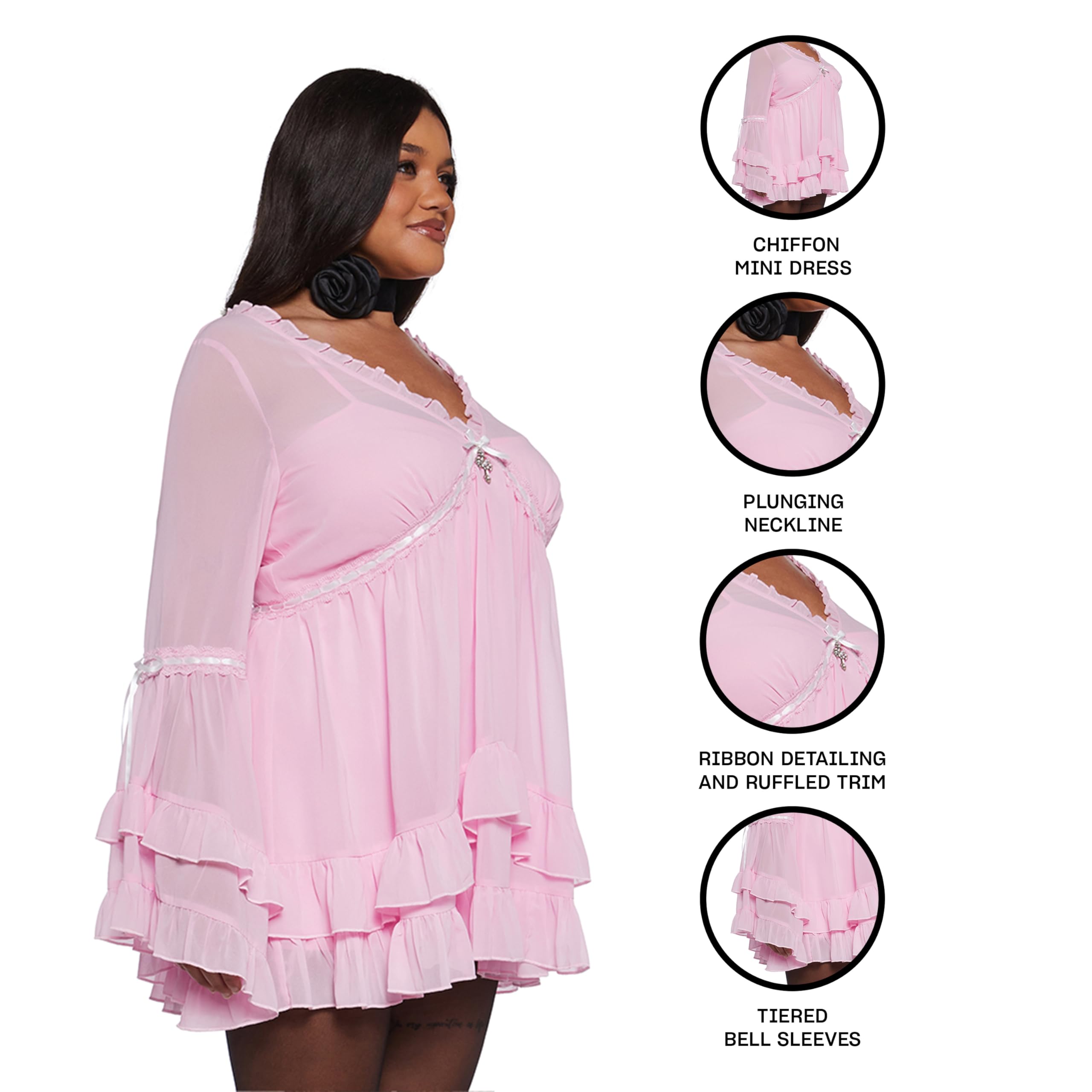 - Divine Design: This chiffon mini dress features tiered bell sleeves, ribbon detailing, ruffled trim, a plunging neckline, and a tiered skirt, creating a heavenly and ethereal look.